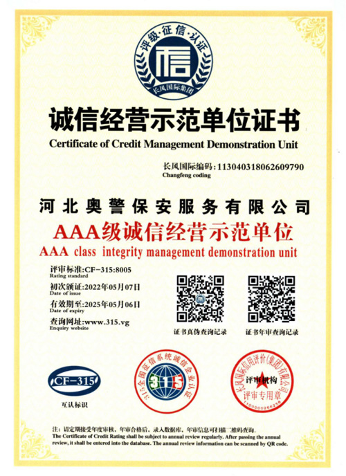 河北奧警保安服務有限公司河北奧警保安服務有限公司成立于2017年7月20日,注冊資金1000萬元,具有中華人民共和國《保安服務許可證》(編號:冀公保服20180085)的綜合性安保企業。